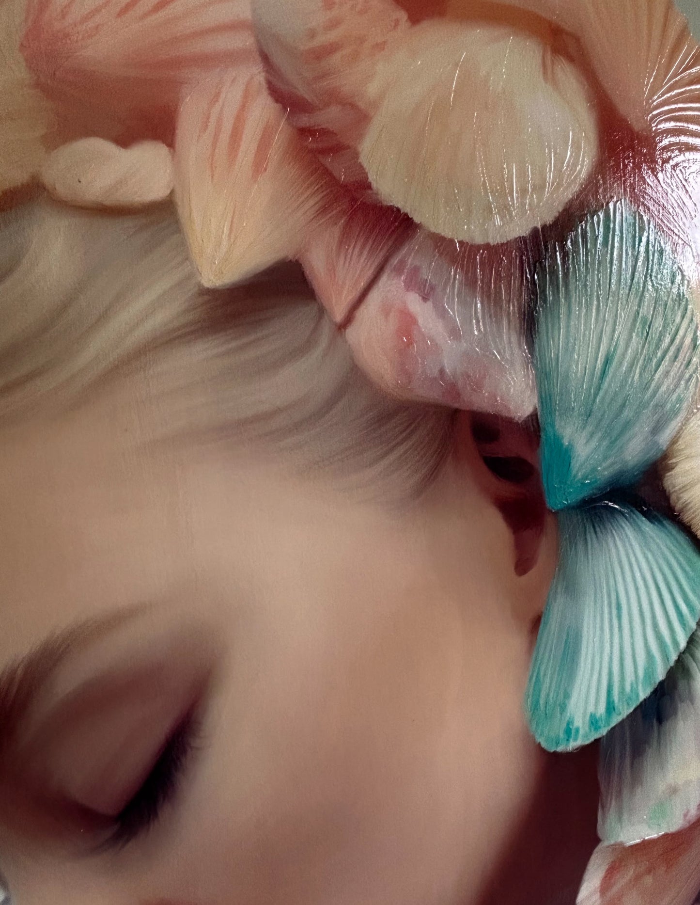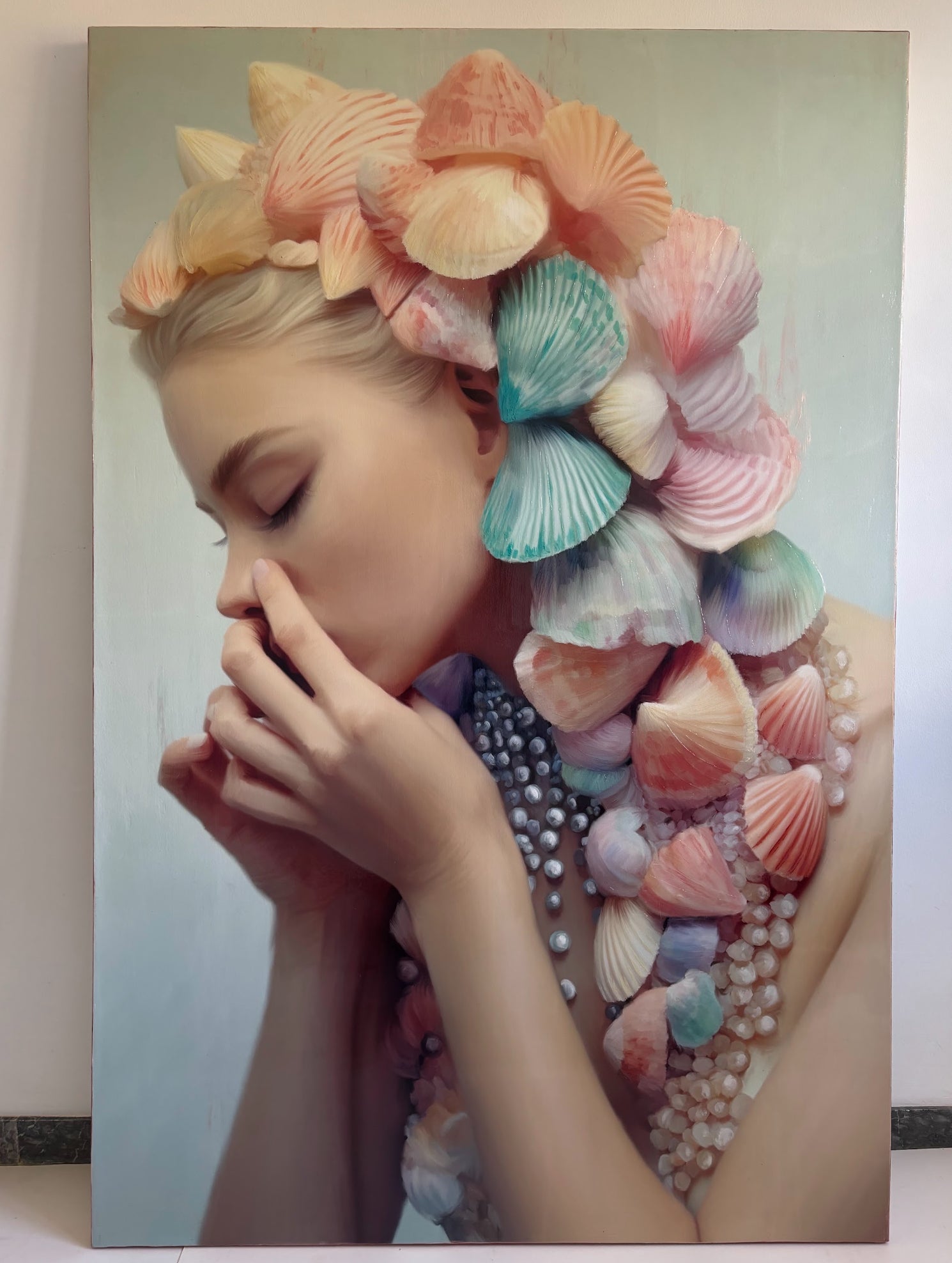 In this captivating canvas, a woman becomes the guardian of the hidden mysteries of the sea. Her hands delicately cover her mouth, as if safeguarding the deepest secrets that only the sea can whisper. With closed eyes, her face reveals an expression of fascination and complicity. The woman becomes an enigma, a bridge between the earthly realm and the secrets of the sea, inviting us to unveil the hidden wonders of the ocean.